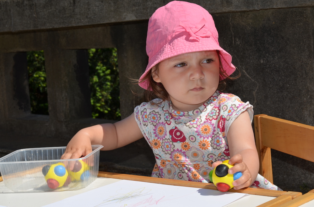 Molti bambini si avvicinano alla creazione/disegno con la palla colorata del marchio olandese SES. Il suo grande vantaggio è la forma: si adatta bene al palmo della mano dei bambini piccoli che non possono ancora tenere in mano una matita. I colori a cera utilizzati lasciano un segno chiaro e netto sulla carta, il che è importante per motivare ulteriormente il bambino (i pastelli di scarsa qualità sono difficilmente visibili sulla carta e i bambini rimangono delusi).