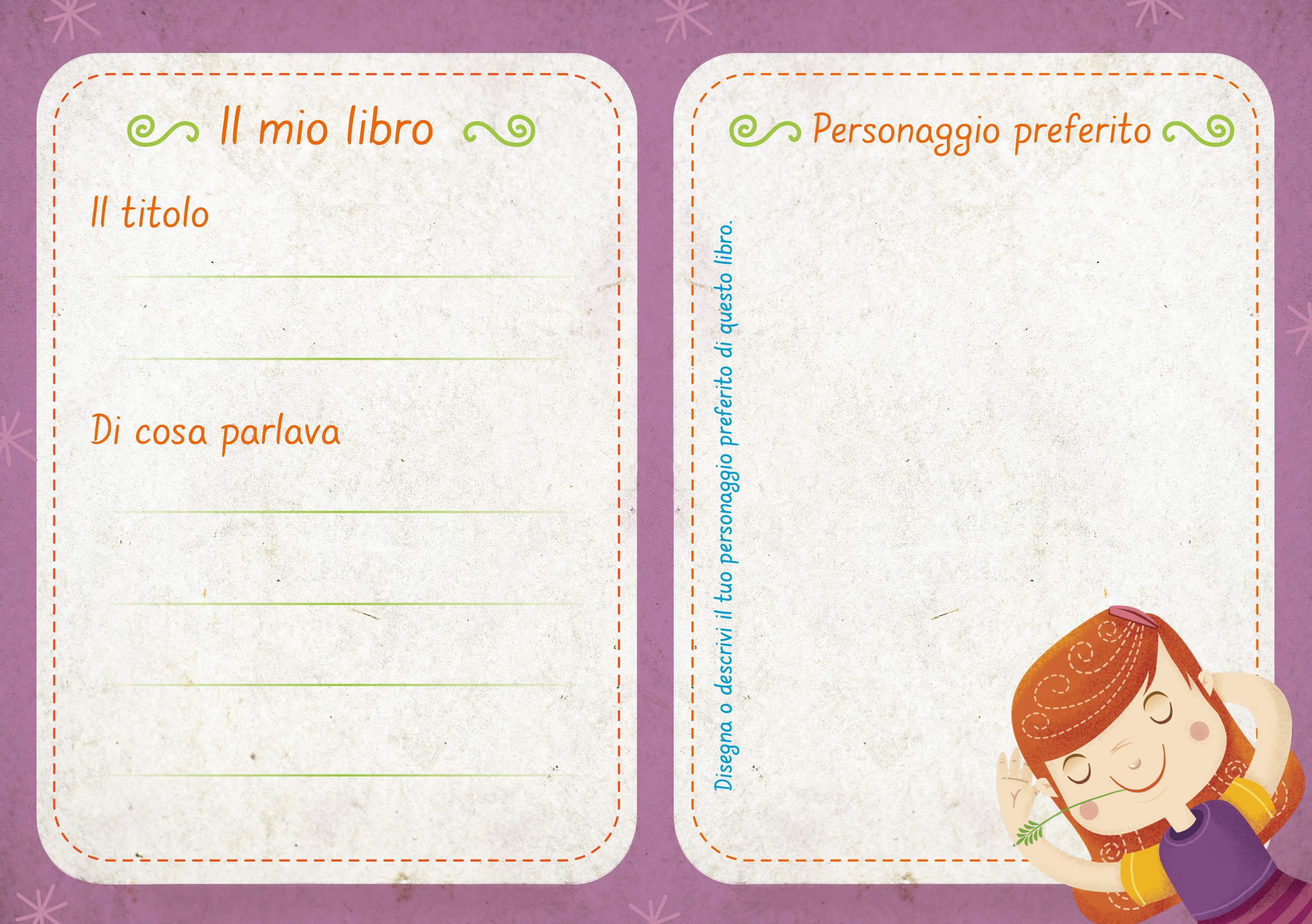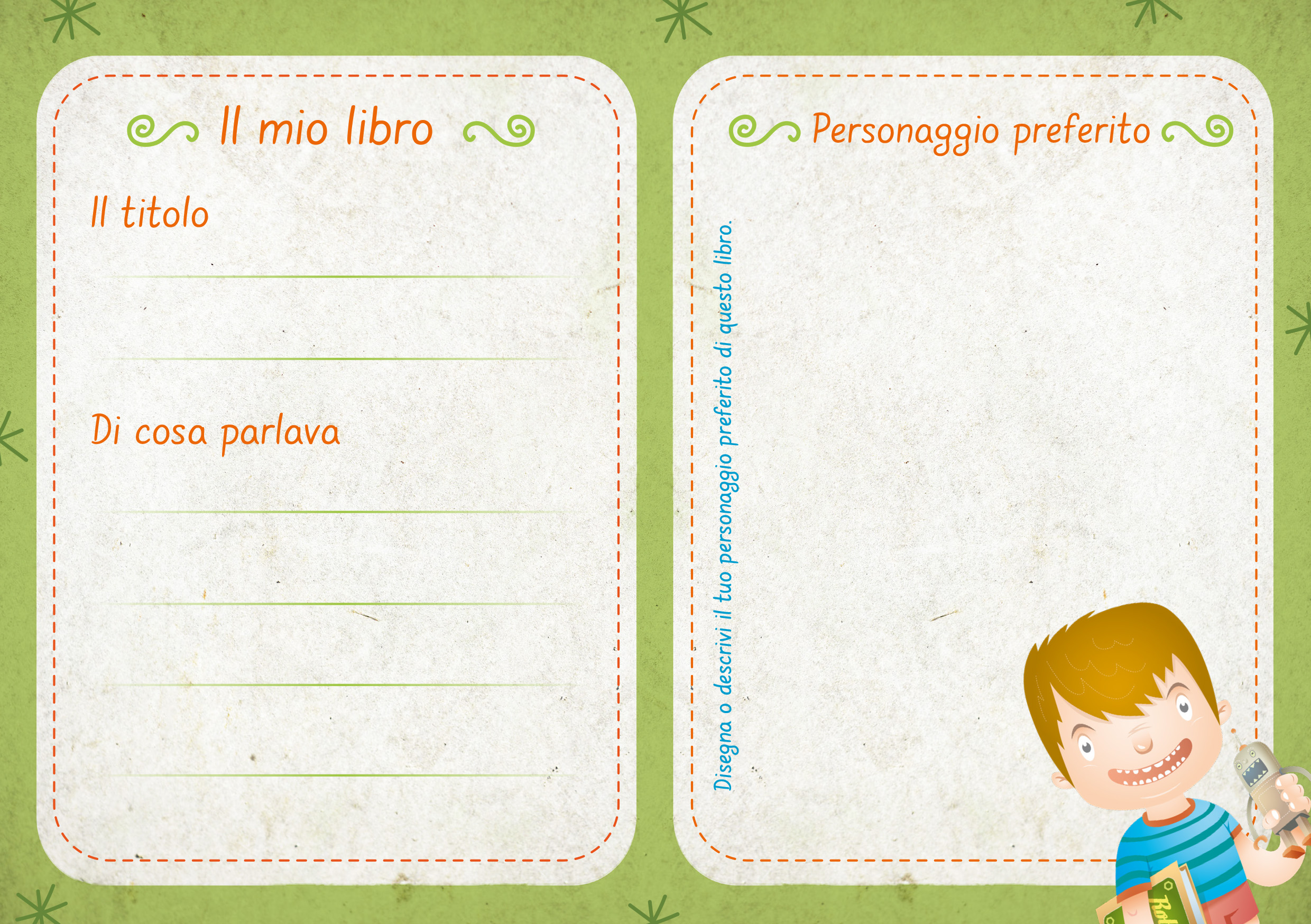 Dove conservare il ricordo del libro letto in modo che il bambino non dimentichi i personaggi preferiti o la trama dettagliata della storia? Che ne dite di provare un diario del lettore? Vi si può scrivere tutto ciò che il bambino vuole conservare dell'esperienza di lettura e può sempre integrare le sue parole con un'immagine adatta. Dopo un po' di tempo, magari quando tornerà a leggere il libro, forse riconsidererà i suoi pensieri e scriverà di nuovo la storia vista con occhi più grandi. Anche questa è la magia dei diari del lettore. A ogni età, infatti, un bambino è affascinato da una parte diversa o da un personaggio diverso della storia.